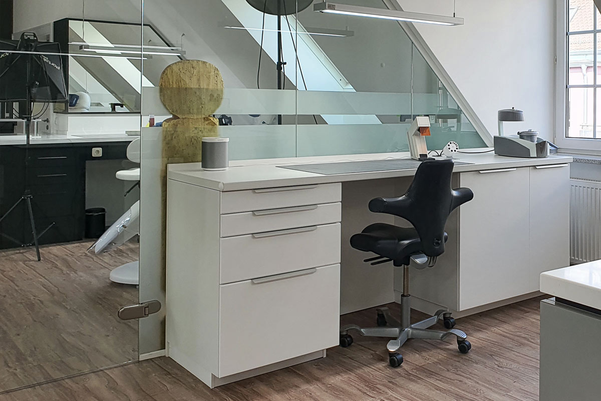 Wir fertigen für Praxisräume von Zahnärzten und Zahntechnikern sowie für Dentallabore anspruchsvolle Dentalmöbel, die den besonderen Bedürfnissen der Zahnmedizin gerecht werden. Dabei produziert unsere Tischlerei, neben Behandlungszeilen und Hygieneschränken, auch Möbel für den Empfangsbereich, wie Empfangstresen und -theken, für Warteräume und Büroräume. Wir bieten auch Komplettlösungen an, welche sich an die individuellen Vorstellungen und Bedürfnisse unserer Kunden anpassen.